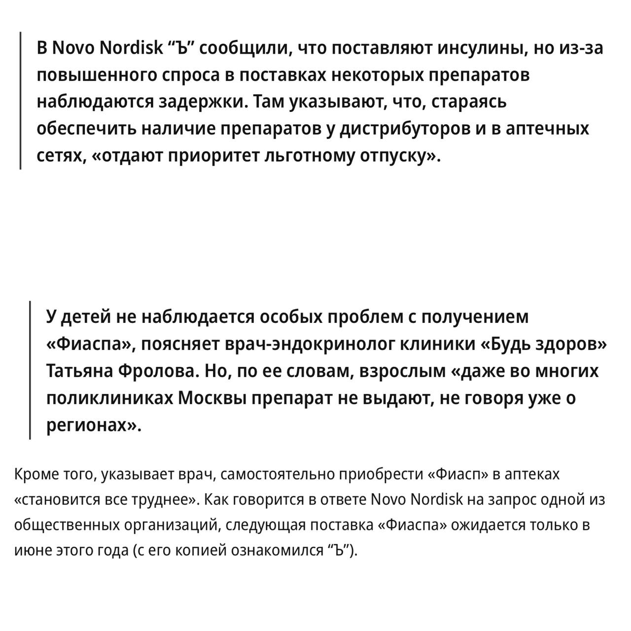 По данным «Ъ», Госзакупки лекарства от датского производителя Novo Nordisk в январе–марте упали на 95 %, до 22 миллионов рублей. Для сравнения — в 2023 году больницы и регионы приобрели «Фиасп» на 442 миллиона рублей.